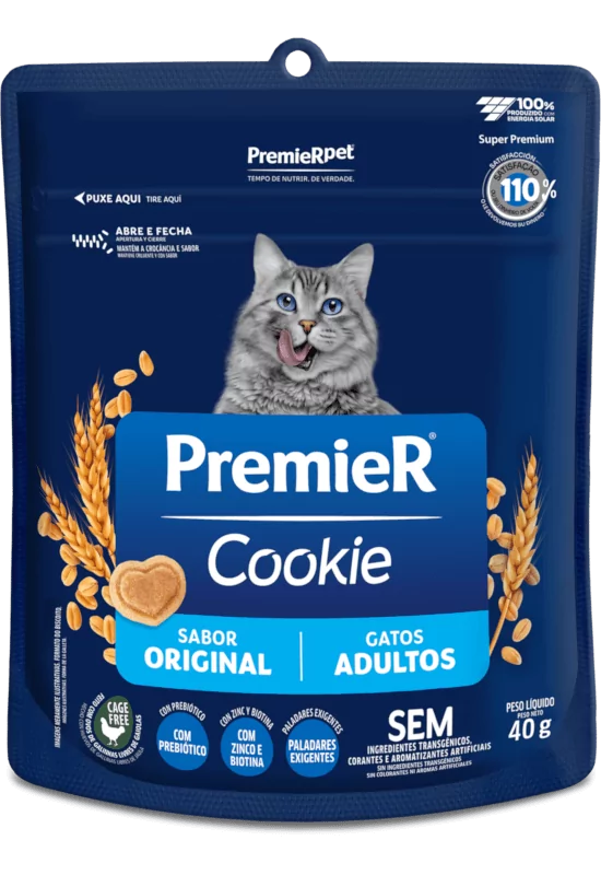 Para retribuir de forma divertida o amor incondicional e amizade que os gatos nos oferecem, a PremieRpet® criou o PremieR® Cookie, um biscoito que reúne qualidade, saúde e sabor, além de ser diferente de todos os produtos encontrados até hoje no mercado. PremieR® Cookie é assado, saudável, nutritivo, possui ingredientes rigorosamente selecionados e satisfação comprovada. PremieR® Cookie Gatos Adultos é indicado como complemento alimentar para gatos adultos. Este produto auxilia no cuidado com a saúde intestinal, beleza da pele e pelagem, além de ser desenvolvido para agradar os paladares exigentes. Outra exclusividade deste alimento são os ovos utilizados em sua formulação, provenientes do sistema de criação Cage Free, no qual as aves são criadas livres de gaiolas, possuem liberdade de movimento, com acesso a ninhos, permitindo assim sua total locomoção.