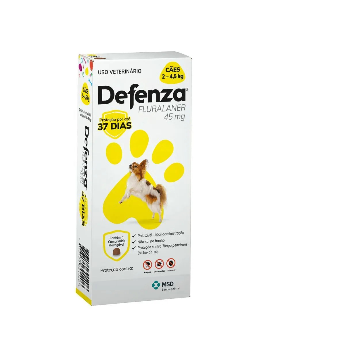Proteção por 37 dias contra pulgas e carrapatos.