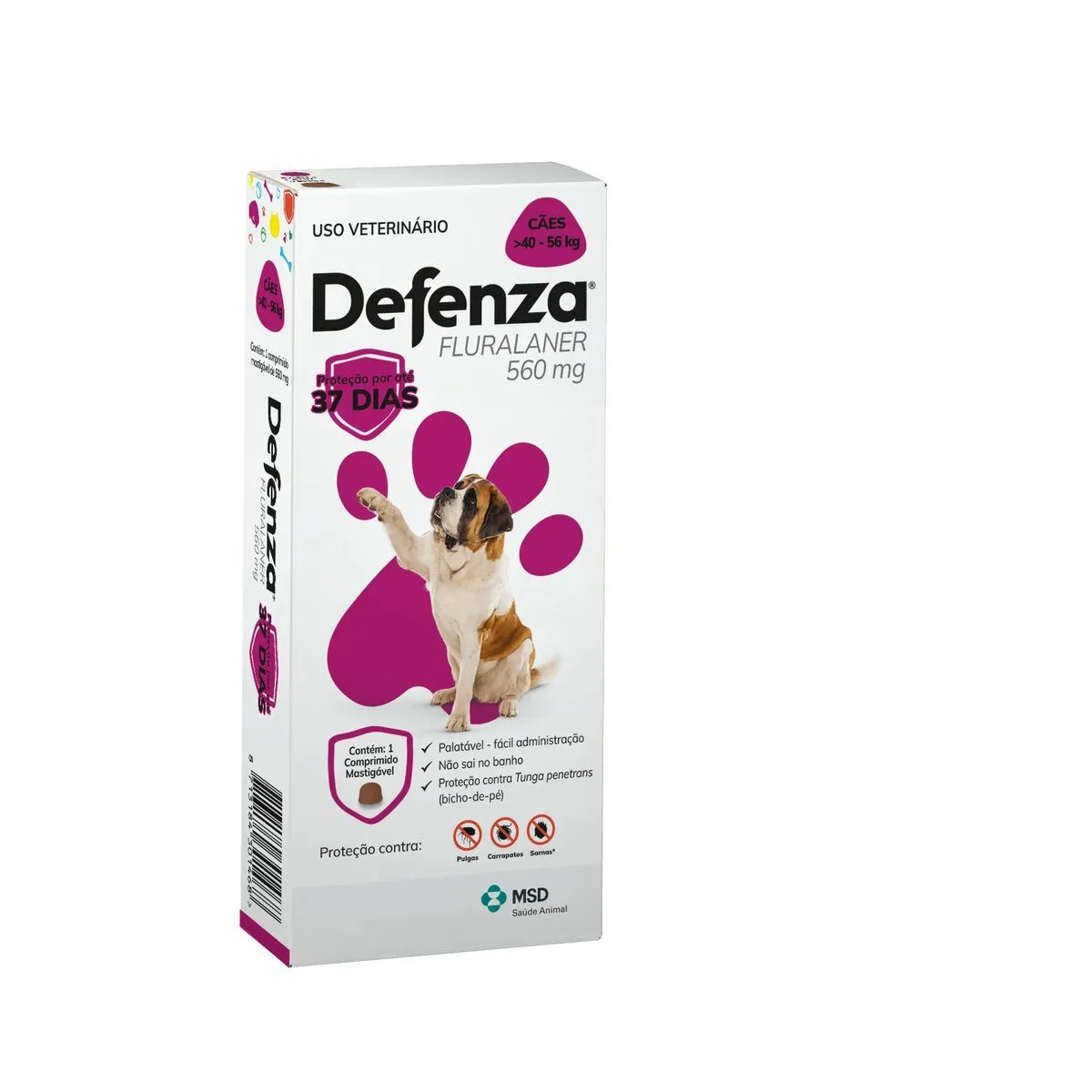 Proteção por 37 dias contra pulgas e carrapatos.