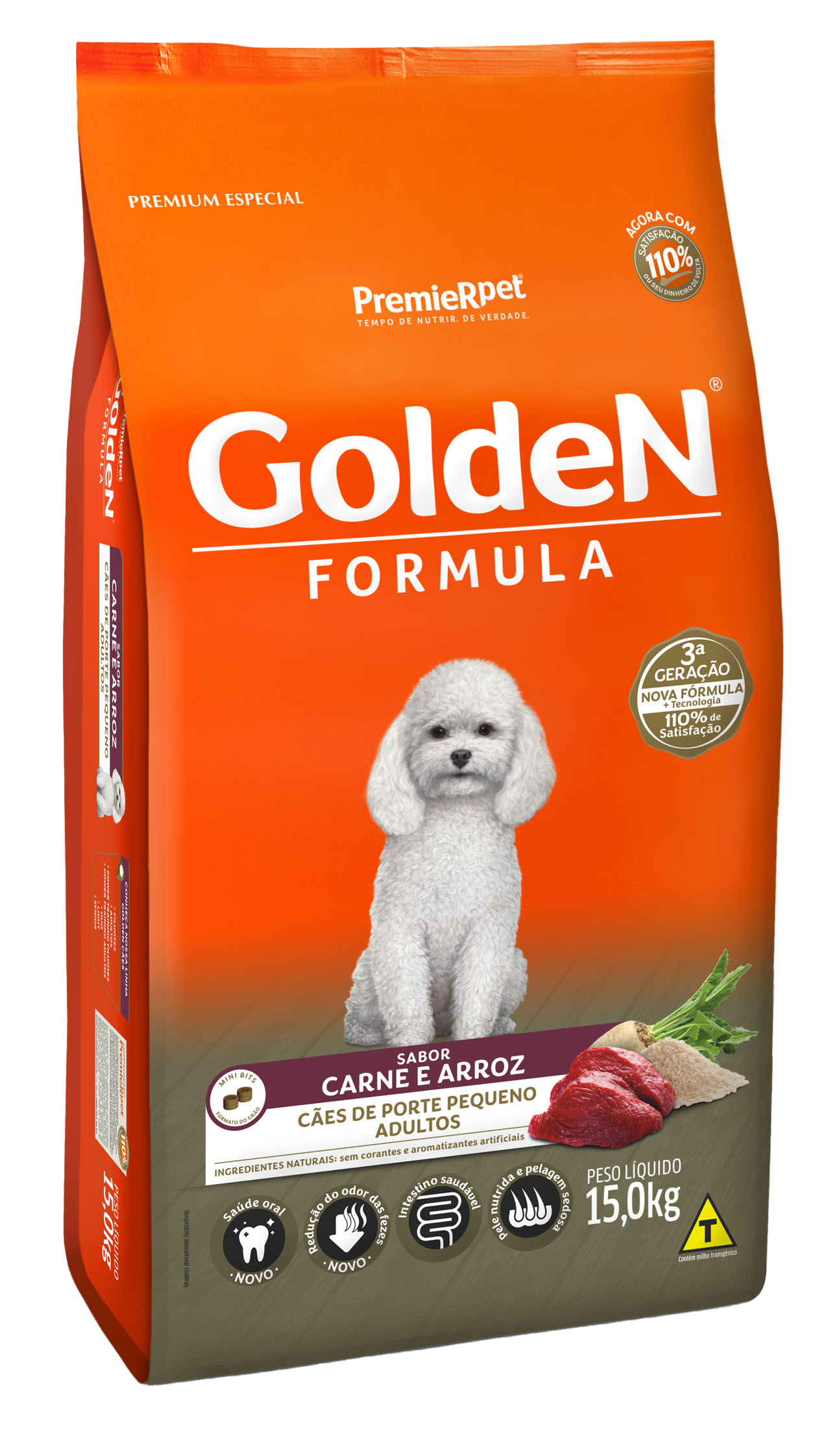 GoldeN Formula Adultos Carne & Arroz Mini Bits é um alimento Premium Especial desenvolvido para cães adultos de pequeno porte.